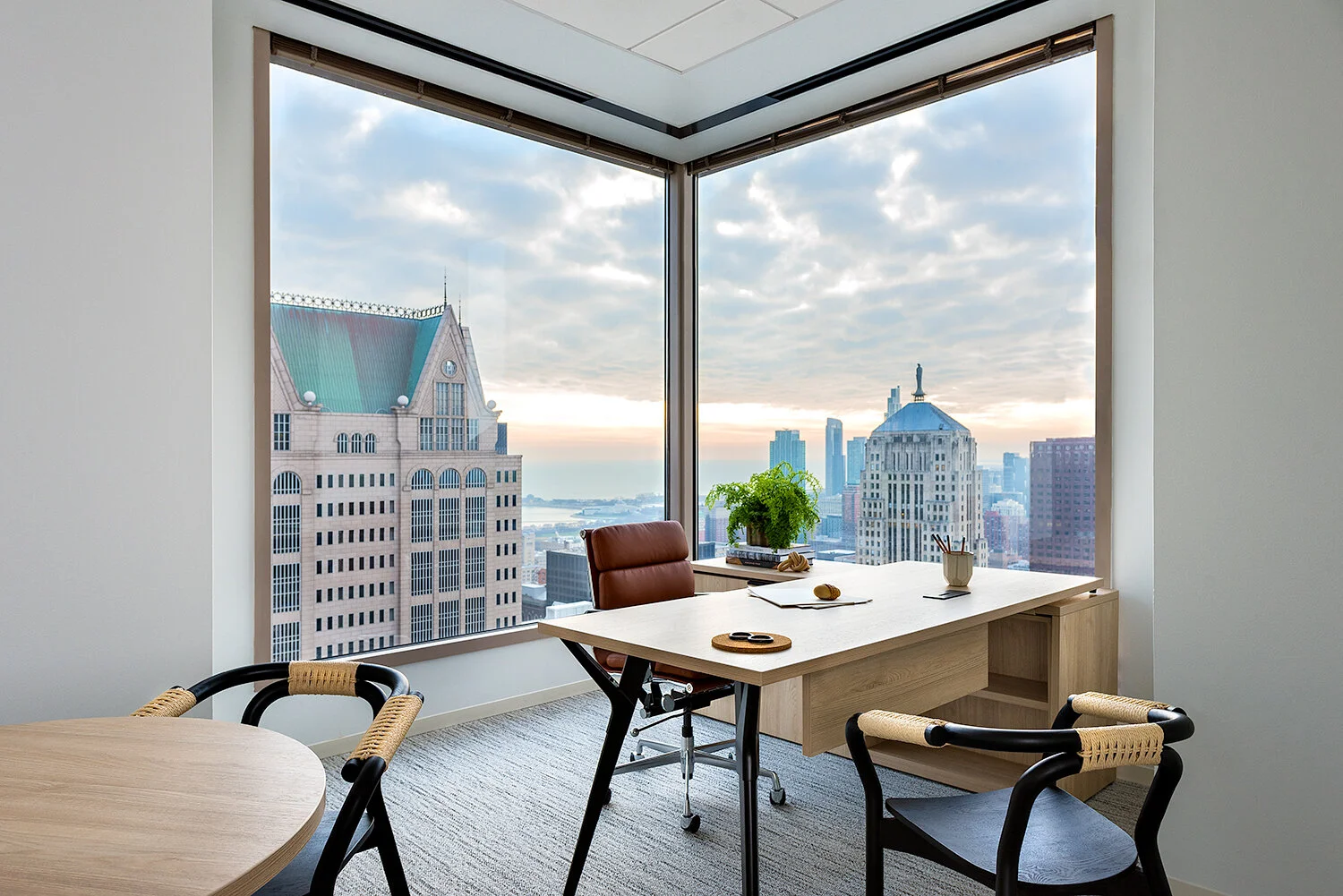 Project Summary: Urban Innovations ltd., worked with architecture firm Charlie Greene Studio to bring this stunning 15,000 SF spec suite to life. A hospitality-forward entry provides a warm welcome with meeting spaces configured adjacent to a hospitality zone. The work areas built were comprised of four distinct zones connected by an open cell ceiling feature. Finishes, furniture, and lighting give the space a crisp and contemporary aesthetic. In addition to the spec suite, as part of the overall project UI renovated the building’s 36th-floor common corridors, elevator lobby, and toilet rooms.